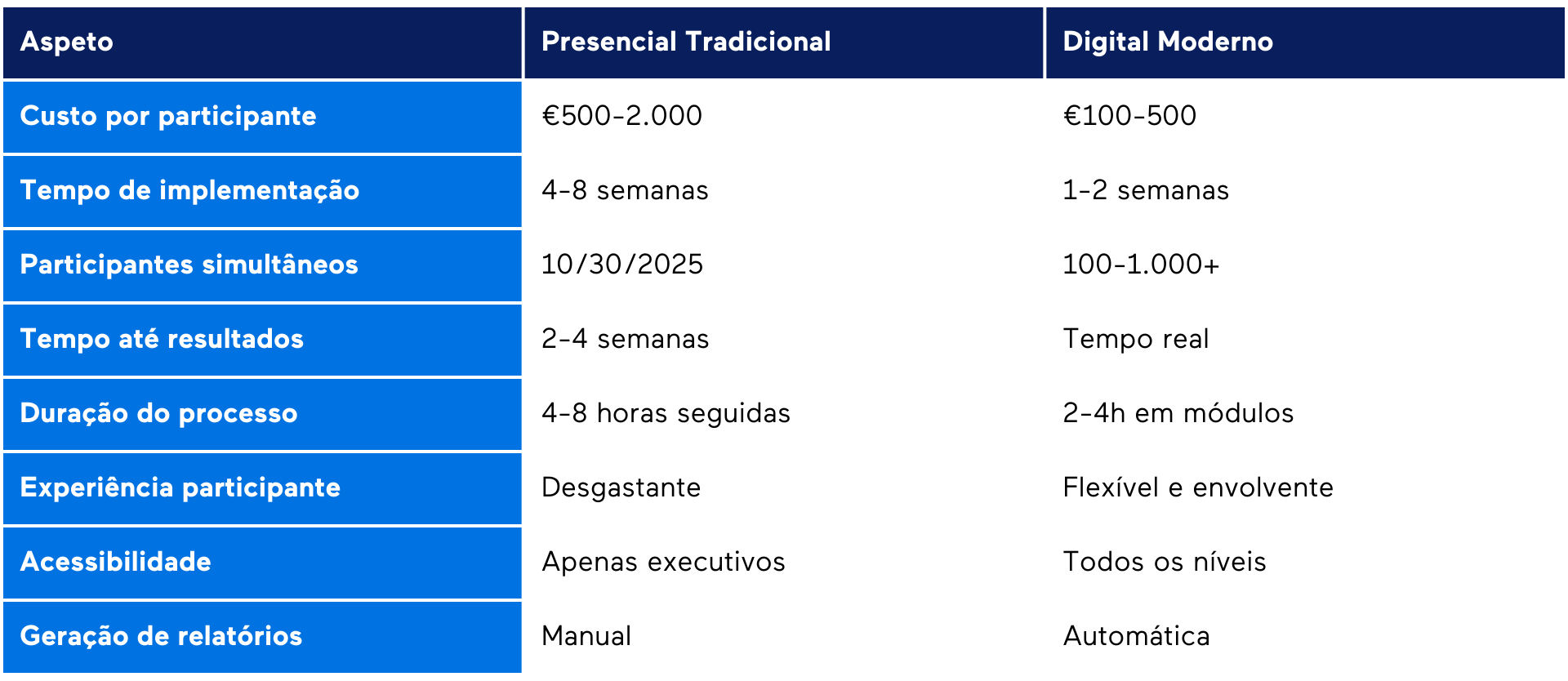 - Velocidade: 2.000 colaboradores avaliados em 3 semanas (vs 6 meses estimados em modelo presencial)