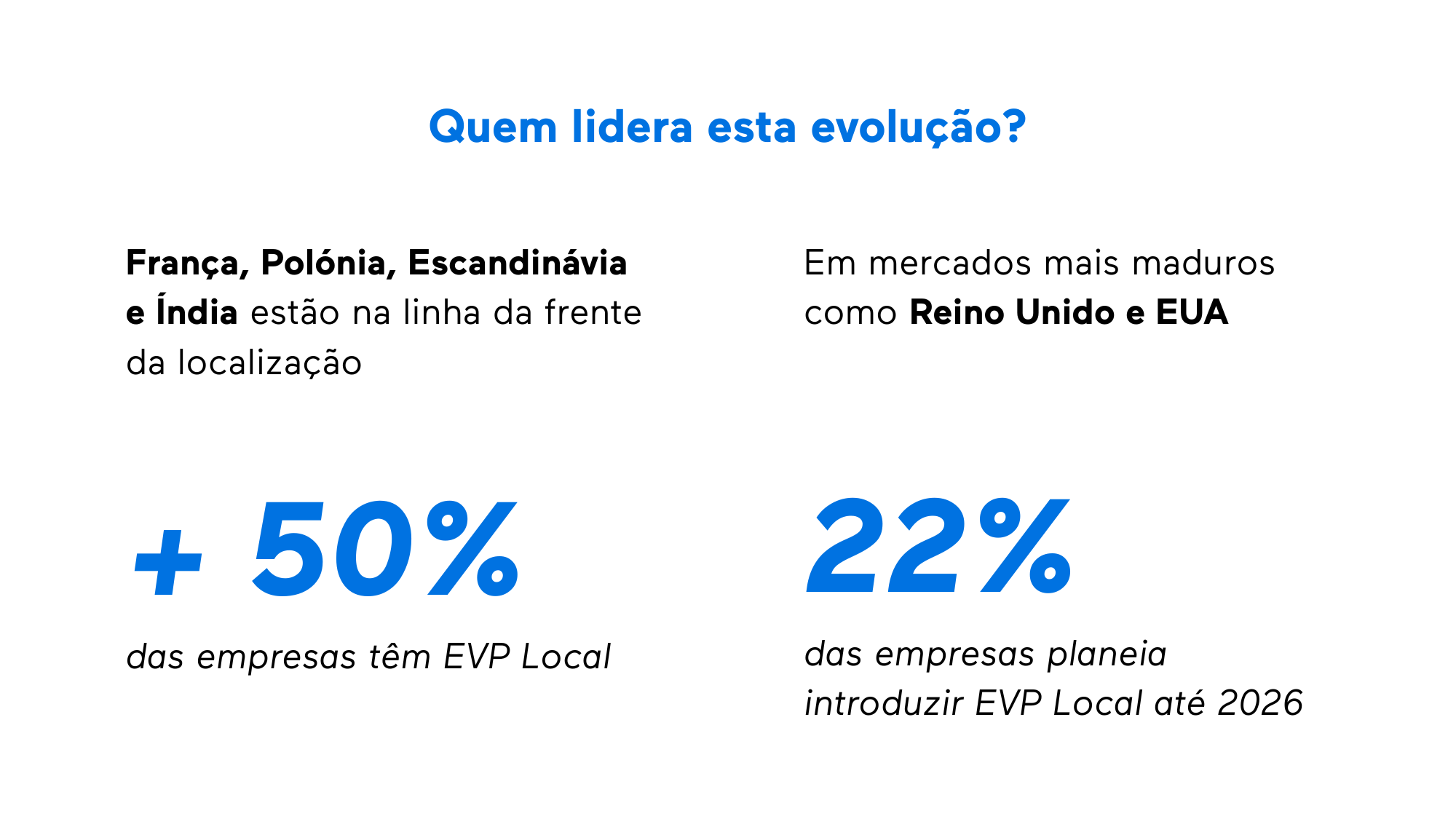 Segundo o estudo internacional Local EVP 2025, apesar de 57,4% das organizações afirmarem ter um EVP global estruturado, apenas 44,3% o adaptaram localmente. E mais: 17,6% reconhecem que a localização do EVP é algo que precisa de ser feito com urgência.